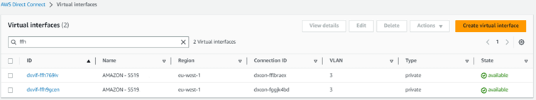 The two Amazon private virtual interfaces will start changing state, first to “pending”, then to “down” and final to “available”. Available means that the connection and the routing protocol BGP has been established.