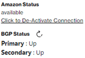 Switch back to Verizon Dynamic Network Manager, the SCI Customer Connection shows Amazon Status “available”. Press the “BGP Status” button, which returns the Primary and Secondary state “Up”.