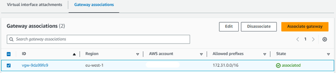 See below an example of a Direct Connect Gateway with Allowed prefixes from the associated Virtual Private Gateway (attached to your VPC).