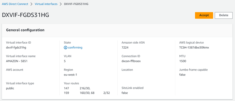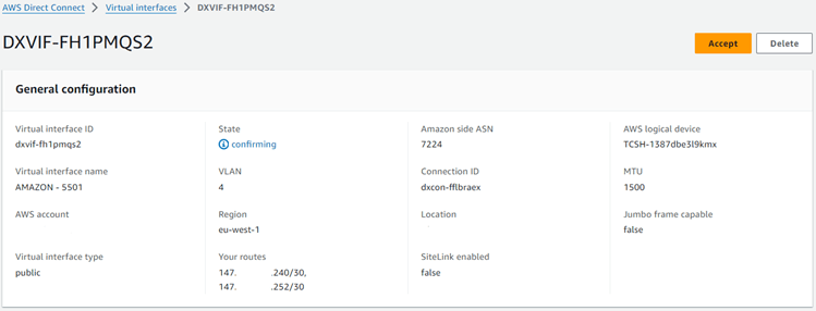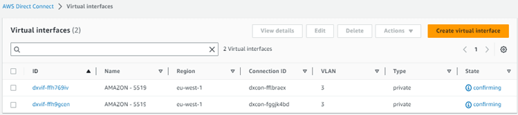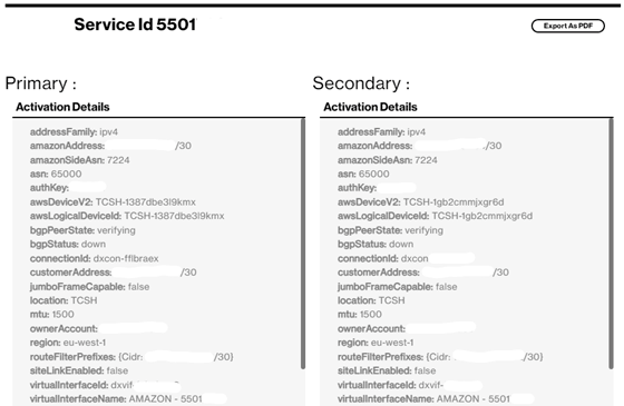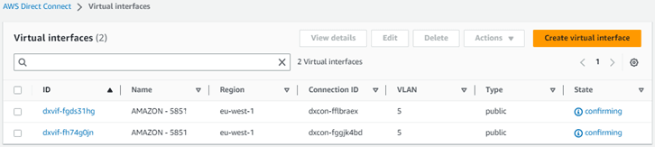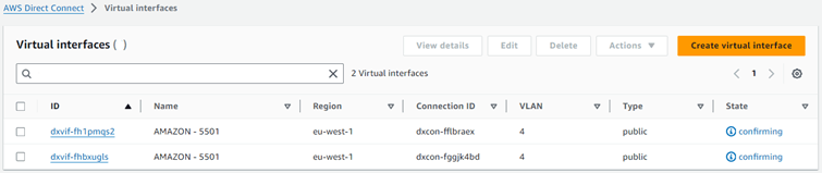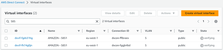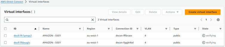 The two Amazon public virtual interfaces will change to state “verifying”.