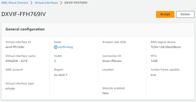 The AWS acceptance procedure will require you to select a Virtual Private Gateway or Direct Connect Gateway. One of these should already have been created.