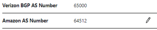 Note: When you create an AWS Direct Connect Gateway you can assign a BGP Autonomous System Number (ASN) which is default set to 64512. In case you change the AWS default value please make sure to modify the SCI Customer Connection Amazon AS Number in the Verizon Dynamic Network Manager “Details” menu by clicking the pencil and modify the Amazon AS Number to the value you will be using.
