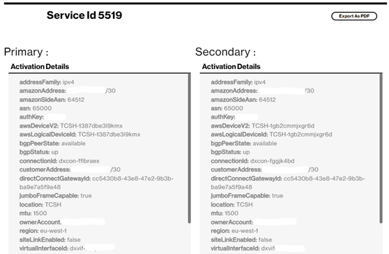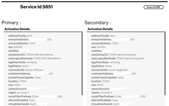 Select the service and look in the menu Interfaces. Search for the SCI Customer Connection Service ID which will find two Amazon public virtual interfaces (VIF’s) in state “confirming”.