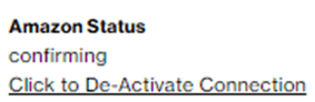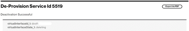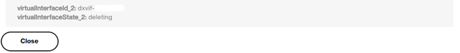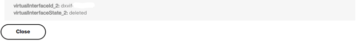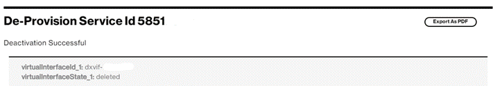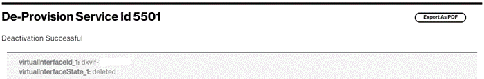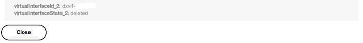 Press “Confirm Deactivate” or press “Close” to cancel the deactivation. The “Confirm Deactivate” will immediately delete both Amazon private virtual interfaces from your AWS Account. The SCI Customer Connection will stop exchanging customer traffic with Amazon. After pressing “Confirm Deactivate” the following screen appears and the Amazon private virtual interfaces will be in state “deleting” or “deleted” which cannot be reverted.