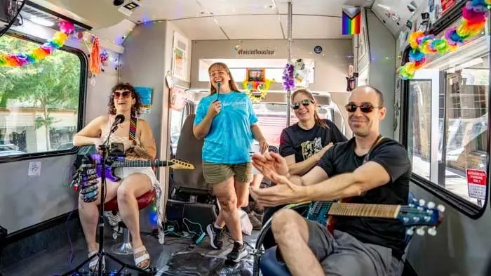As the head of the company, Harbaugh also occasionally works as a tour guide and hires the live, on-board bands that are the Twisted Texas Tour trademark. Photo credit: Inti St. Clair