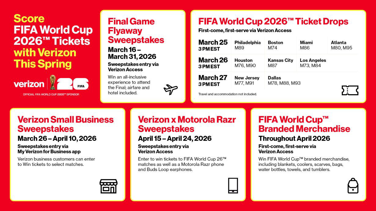 As part of Verizon Ultimate Access to FIFA World Cup 2026™, Verizon is announcing multiple new ways for customers to win free tickets to the FIFA World Cup 2026™, bringing fans closer than ever to the action: