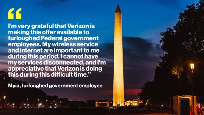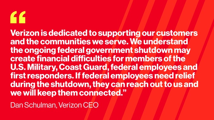 “Verizon is dedicated to supporting our customers and the communities we serve. We understand the ongoing federal government shutdown may create financial difficulties for members of the U.S. Military, Coast Guard, federal employees and first responders,” said Dan Schulman, Verizon CEO. “If federal employees need relief during the shutdown, they can reach out to us and we will keep them connected.”