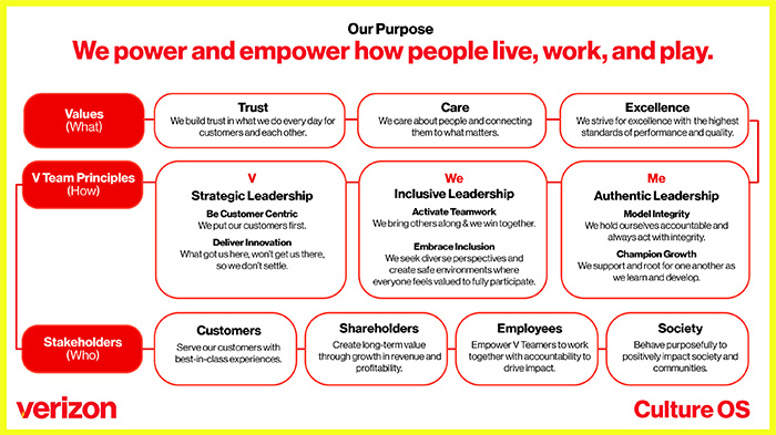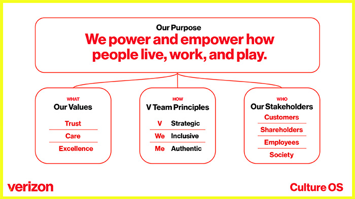 Every company needs a purpose. It’s the reason the company exists and highlights our meaningful role in the world. For decades, Verizon has been known for its trusted and reliable network, and we have earned that recognition by serving our customers in a way that only we could do. Now, we need to build on our industry-leading reputation and celebrate how we enrich people’s lives, starting with a new purpose: