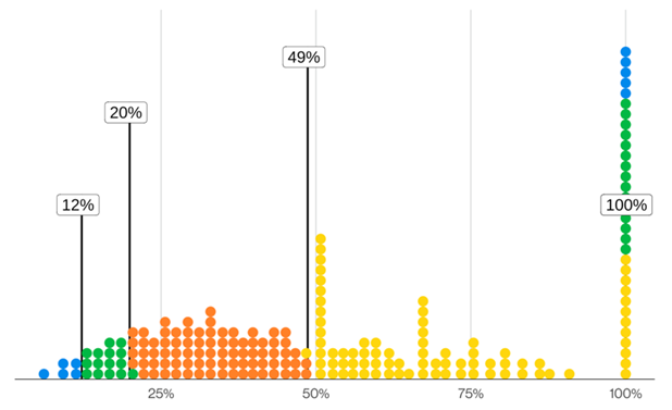 Figure 2. Percentage of unique saved passwords per compromised device found in infostealer logs (n=14,742 - each dot is 73.71 users)