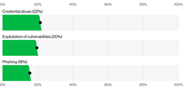 - The use of compromised credentials was an initial access vector in 22% of the breaches reviewed in the 2025 DBIR.