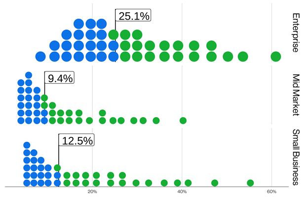 Figure 3. Percentage of authentication events that are credential stuffing attacks grouped by organization size (n=2,301)