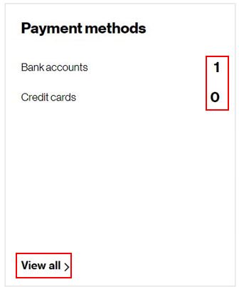 - Click on the count of accounts for each of the payment methods to view the relevant list of saved bank accounts and credit cards, and take preferred action