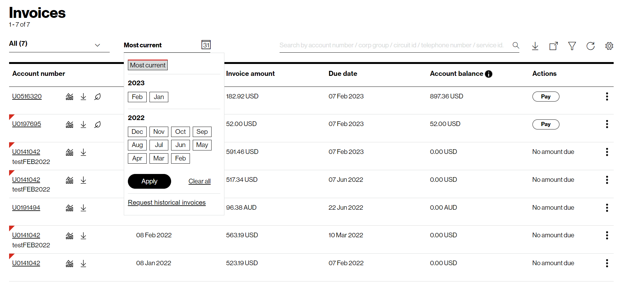 4. To further filter your invoices to view a specific account, click the filter icon and enter one or multiple account numbers separated by commas and select Request historical invoices
