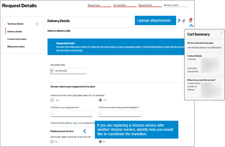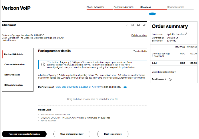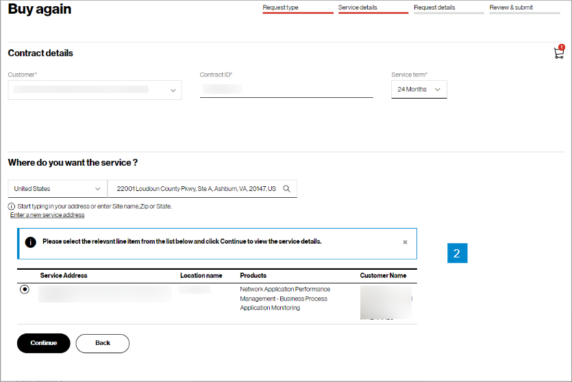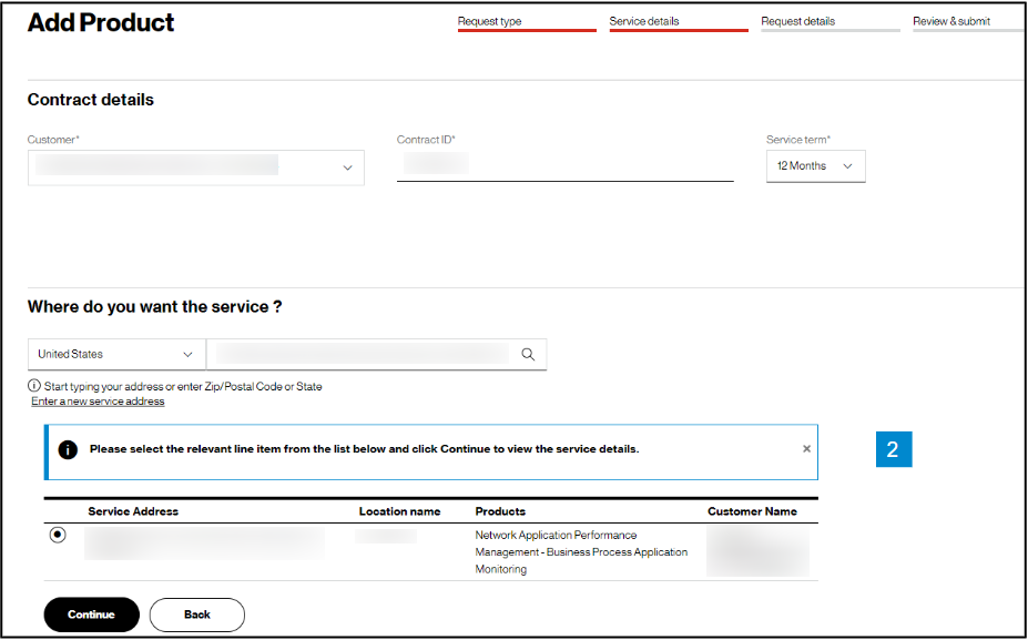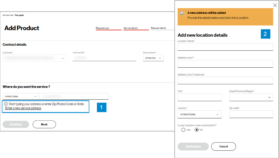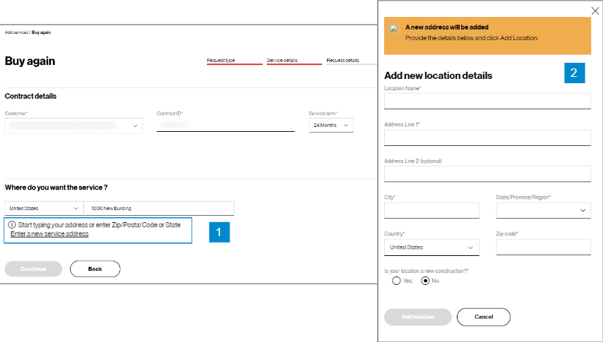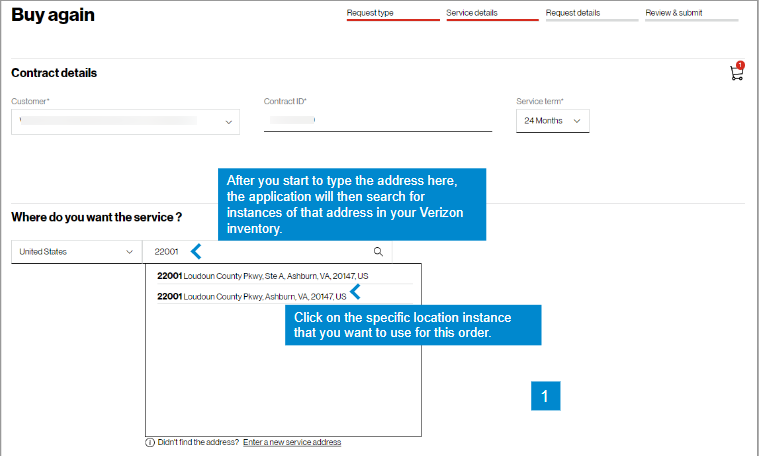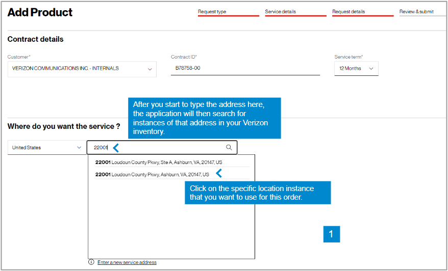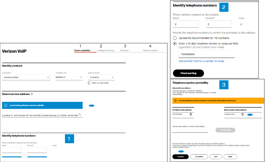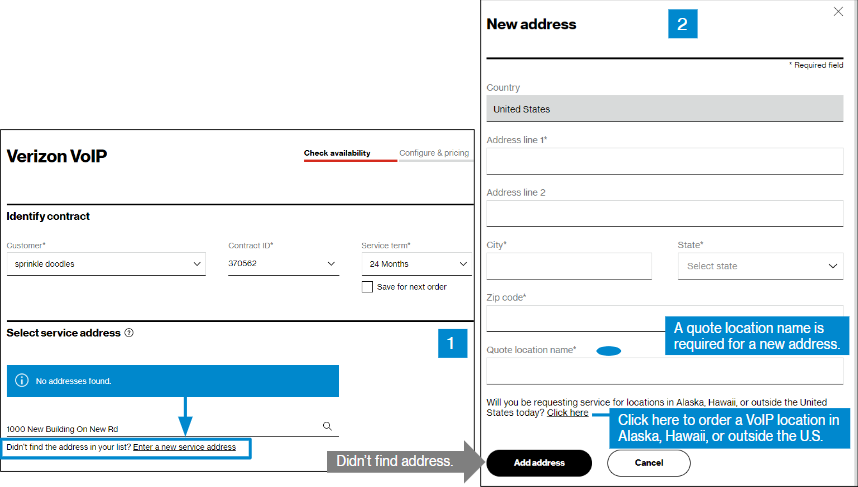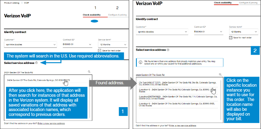 In the Check availability step, select your Customer Contracting Legal Entity (CLE), your contract, contract service term, and input the address for which you want new Verizon VoIP service (image 1). If you only have one CLE, it will pre-populate.
