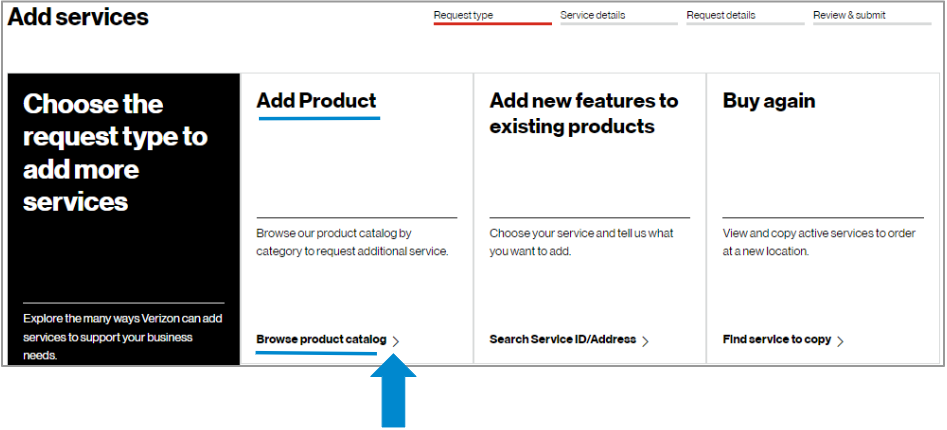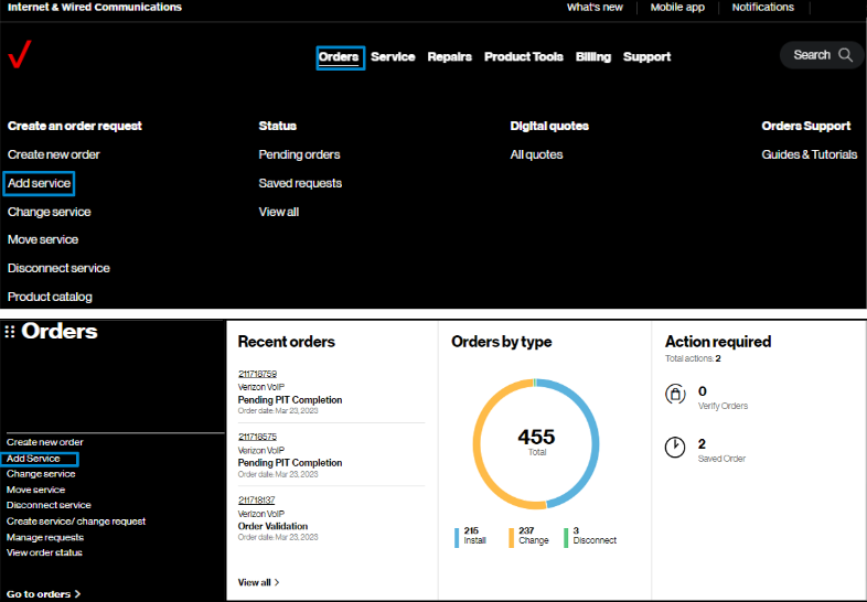 2. Hover on Orders and click on Add service under Create an order request.. On the Verizon Enterprise Center home page, you can also click on Add service in the Orders pod for the same option to create an order.