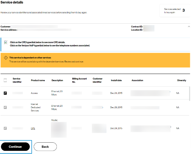 5. Review your service identifiers and associated linked services before selecting them to buy again.