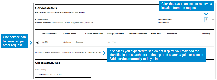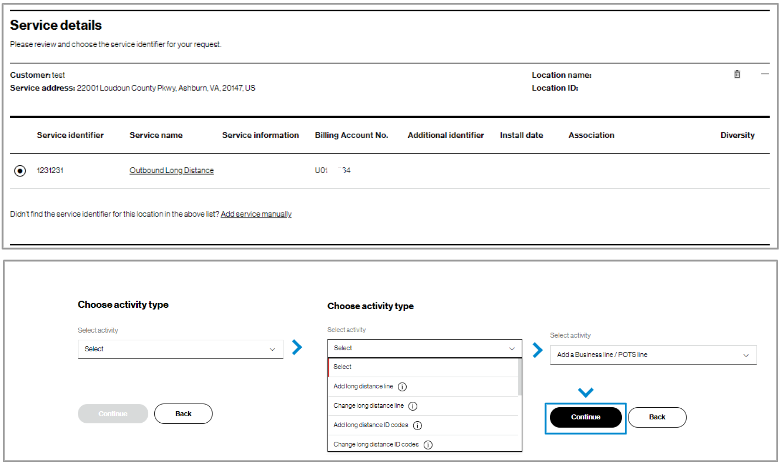 Adding service identifiers by typing them in | When you don’t see a service you are looking for, it could be that the service address has more than one Location ID. Or, it could be that the service is much older and it may not have a Location ID. Include these services by entering them manually and a Verizon representative will review them. |
