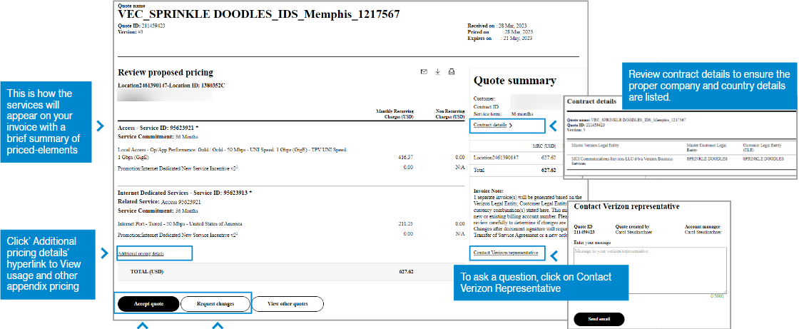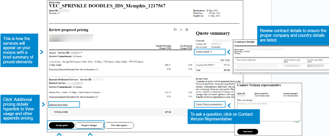 20. The quote displays as a digitized version of the PDF file. To accept the quote, select Accept quote. This alerts the representative who prepared the quote that you have accepted the pricing and they can proceed to prepare the contracting portion, as required. To request a change to the quote such as a new speed or feature, select Request changes and briefly describe the change. This alerts the representative who prepared the quote to make the change and send an updated quote, accessible via a new email and online by hovering over Orders and clicking on All quotes under Digital quotes.