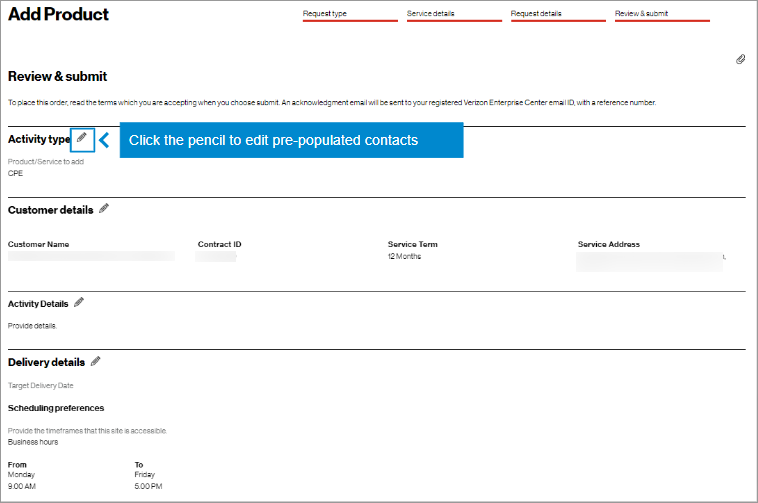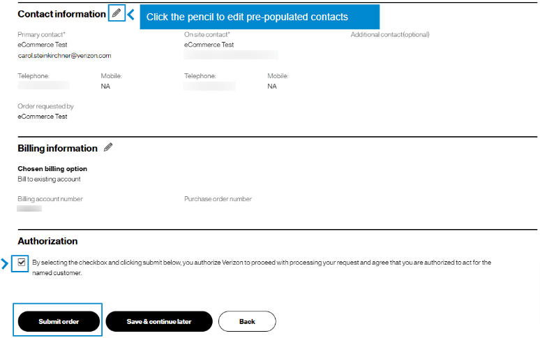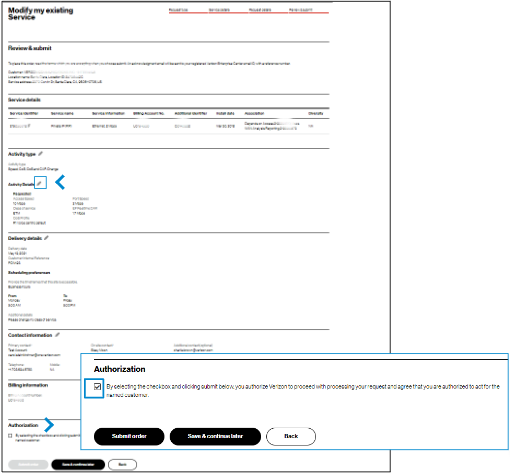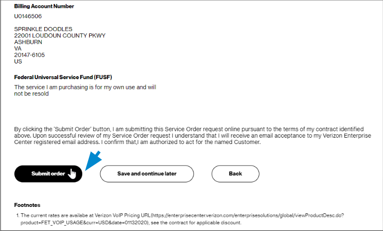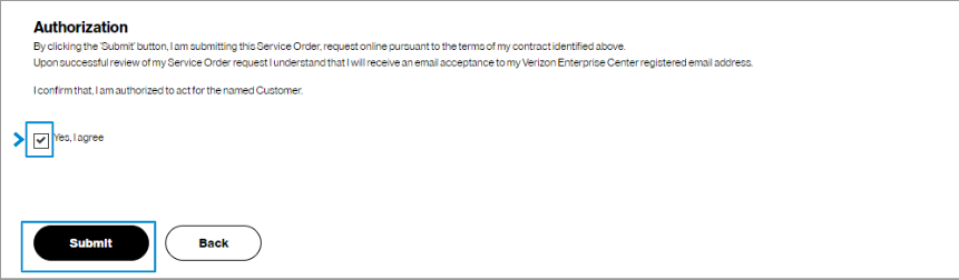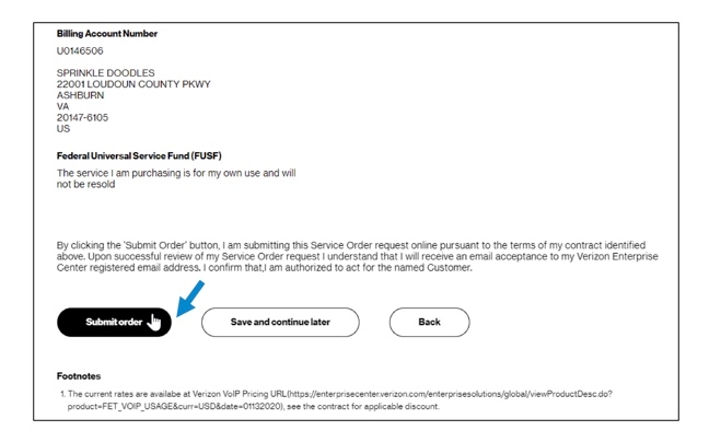 19. At the bottom of the Review & submit page, click on Submit to place your order. Once submitted, you can track your order in Verizon Enterprise Center by hovering over Orders > Pending Orders.