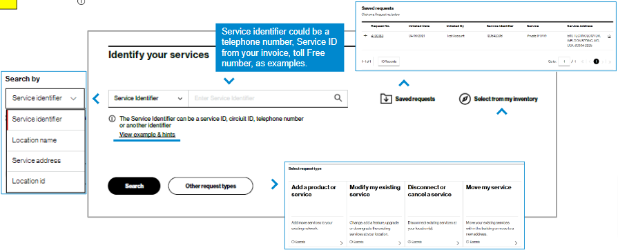 Other ways to locate the service you want to change | If not finding service, try searching by service ID, circuit ID, telephone number, service address, location name, or location ID. Click on the caret to the left of the search field to change the way you search. |