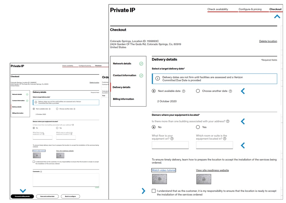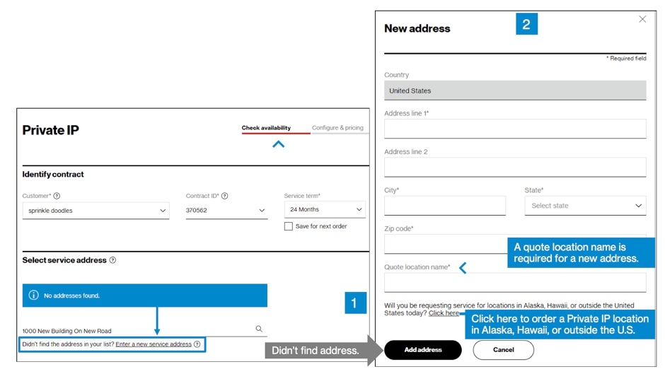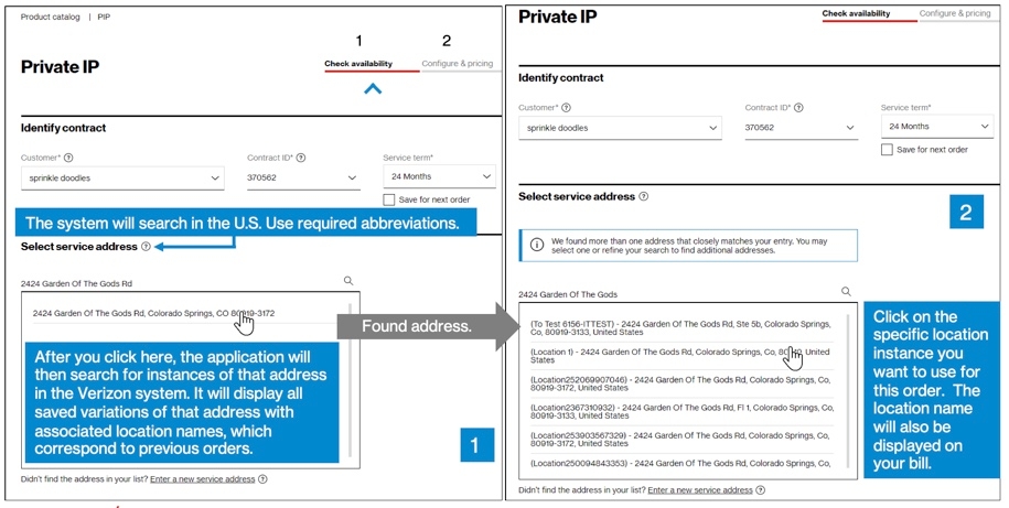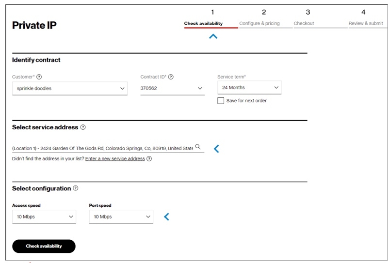 In the Check availability step, select your Customer Contracting Legal Entity (CLE), your contract, contract service term, and input the address for which you want new Verizon Private IP service (image 1). If you only have one CLE, it will pre-populate.