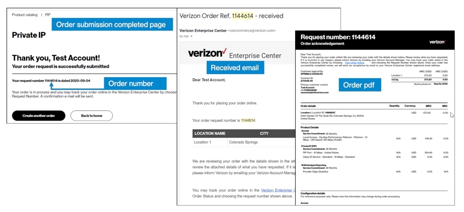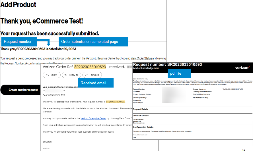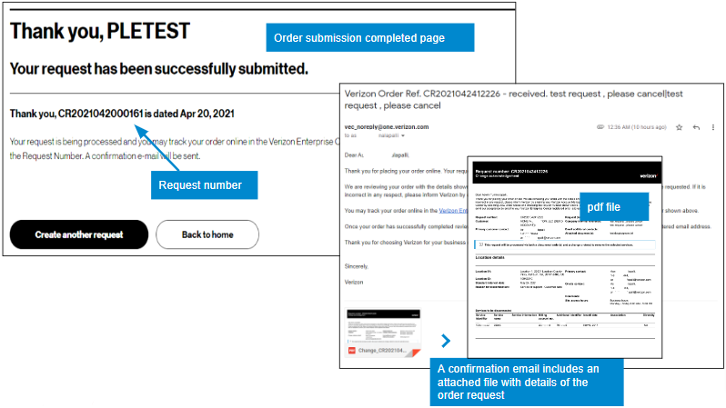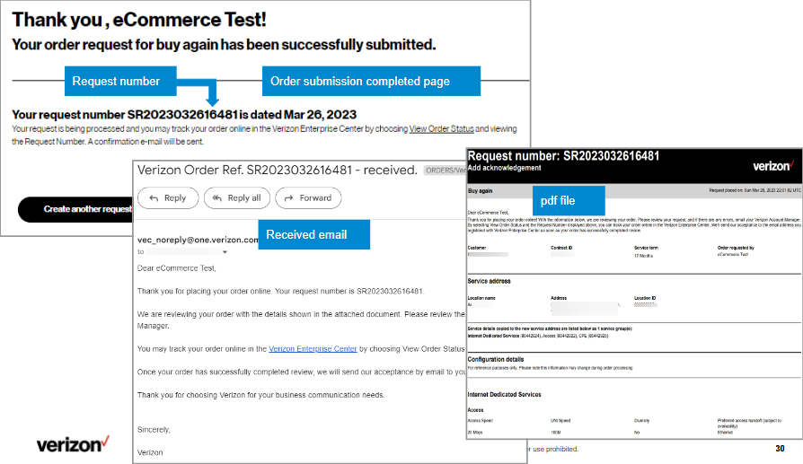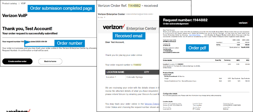 20. After you click Submit, you will see a message that gives you your order number, and you will receive an email confirming your order that includes a pdf file of your order details. If your account team needs to take action on the order, you will receive an email that says your order is pending. When your order has reached order request stage and been accepted, you will receive an email saying it has been accepted. If your order does not have porting, you will also receive an email to schedule service activation and testing with an activation engineer. Verizon strongly encourages testing.