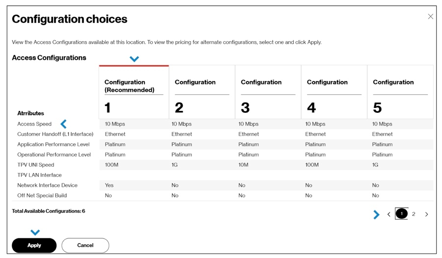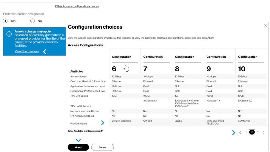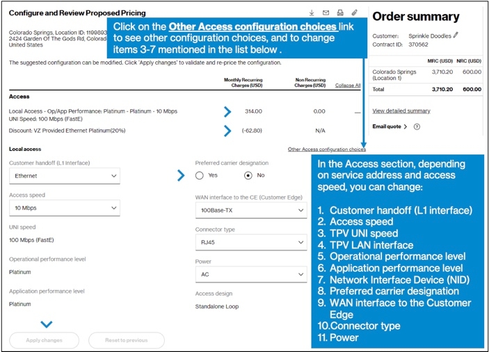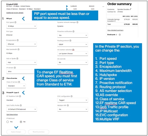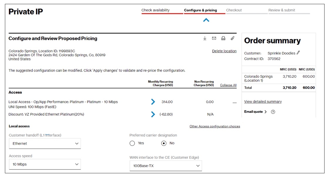 This page will include the Access and Private IP configuration sections. You may also have a section for WAN Analysis Reporting, depending on your contract. Pricing for each part of your order is shown at the top of each section, including any discounts and promotions on your contract, if present.