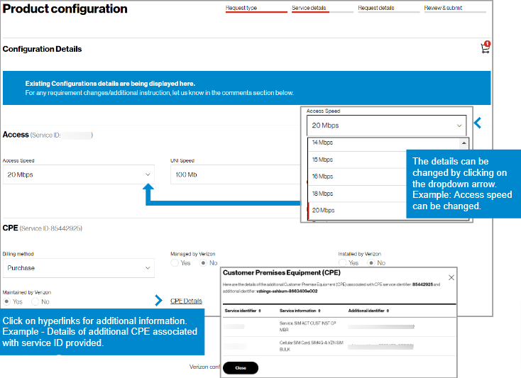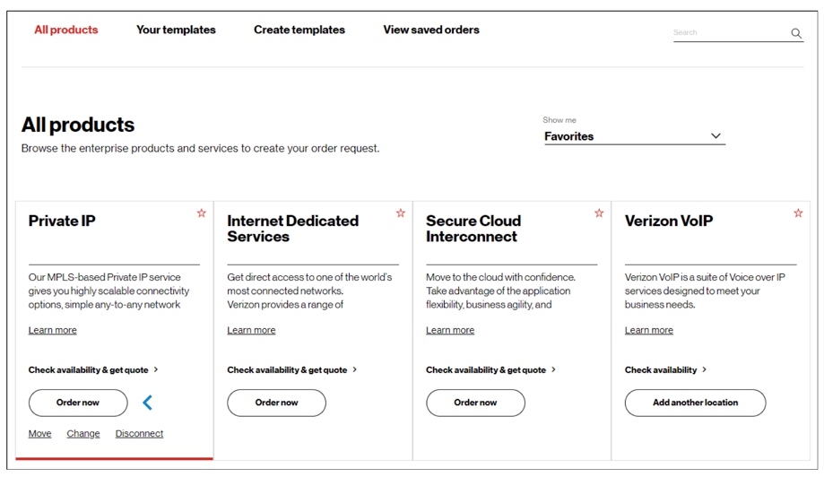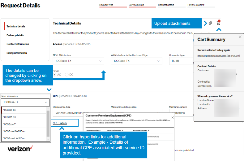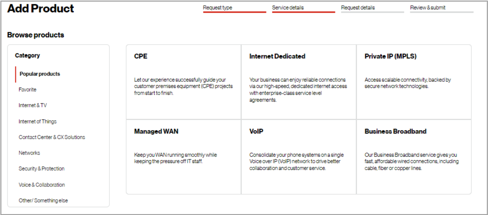4. Browse Verizon’s product catalog by category and request additional service. In this example, CPE was chosen.