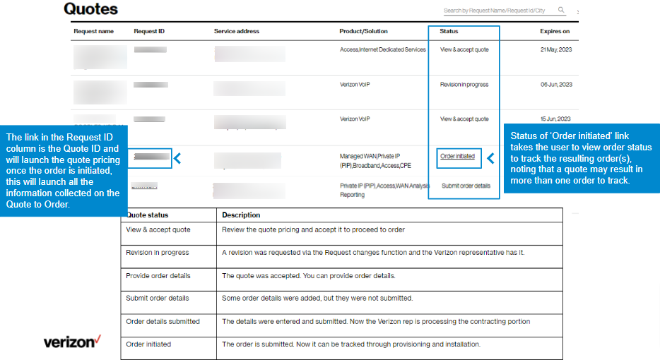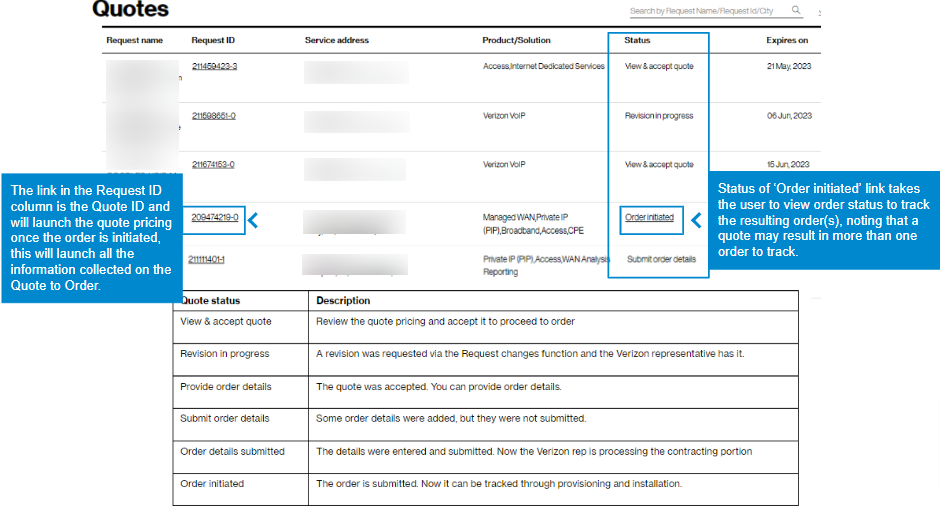 Status. Once the quote becomes an order, the status changes to ‘Order initiated” and you can click on it to view your order status.