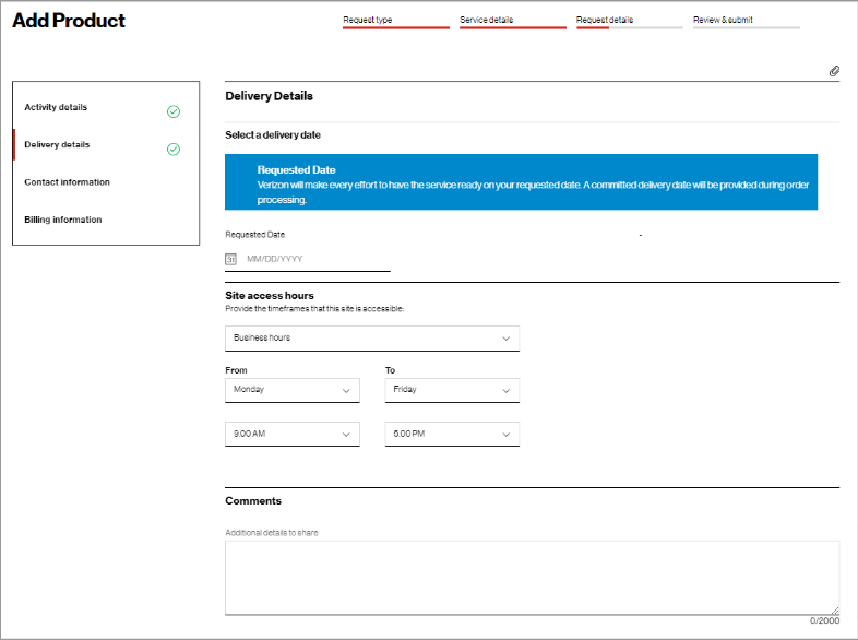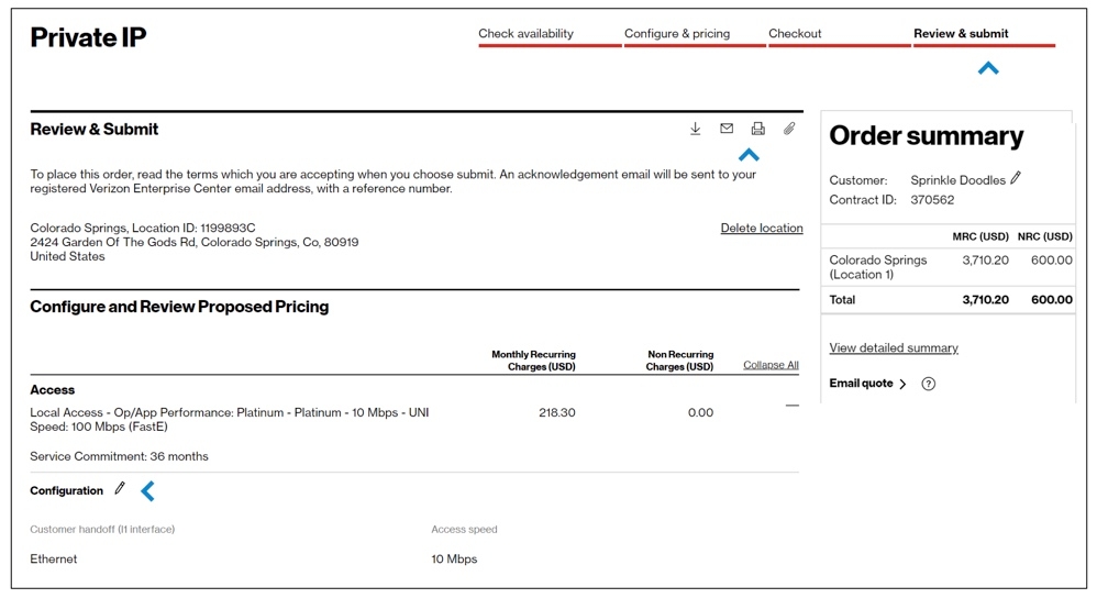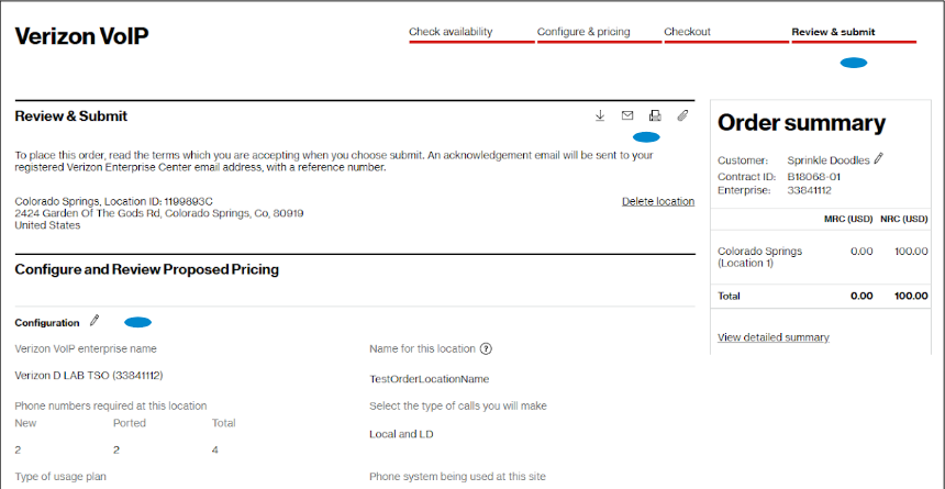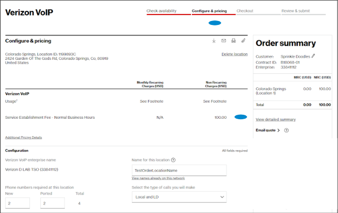 These order requests for additional new service will be sent to a Verizon representative to quote for you. The pricing will not be shown in near real-time on the screen, but it will be sent to you via email and it offers a digital display in Verizon Enterprise Center by hovering over Service and clicking on All quotes under Digital quotes.