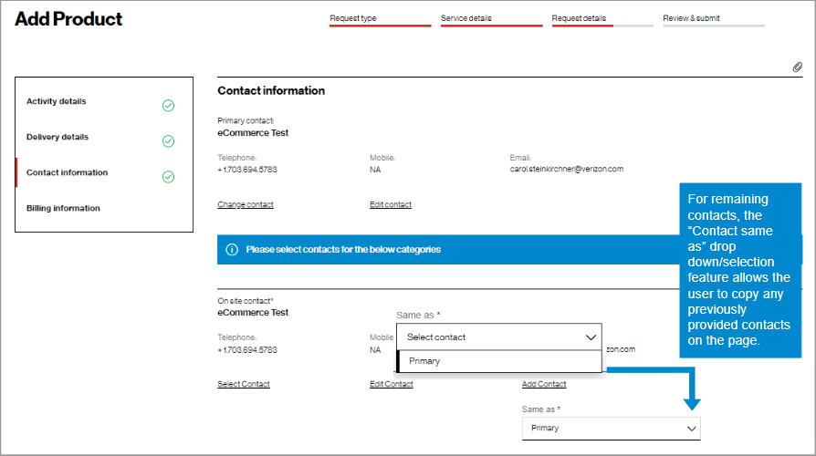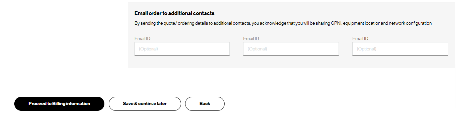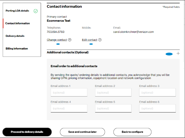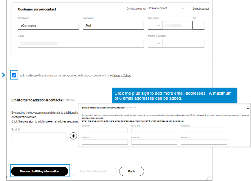 9. For Contact information, you will be the primary contact since you are placing the order. You can edit your contact information if needed, add an On site contact, and enter up to three additional email addresses to receive the order confirmation. (image 1). Then click Proceed to billing information.