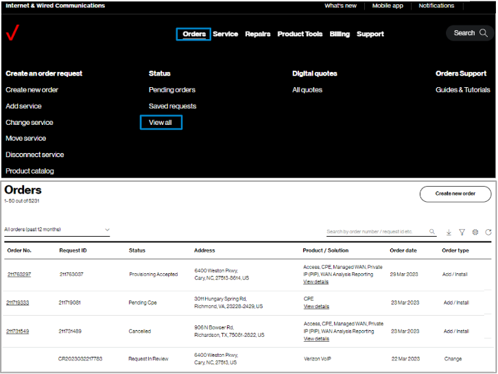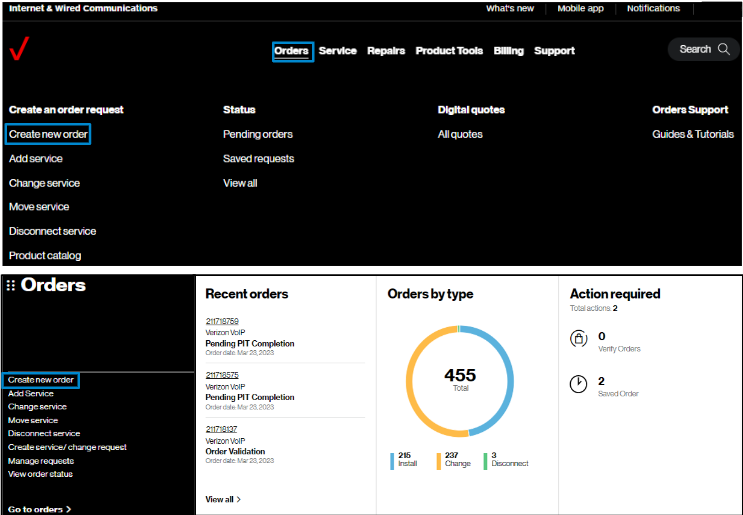2. Hover on Orders and click on Create new order under Create an order request.. On the Verizon Enterprise Center home page, you can also click on Create new order in the Orders pod for the same option to create an order.