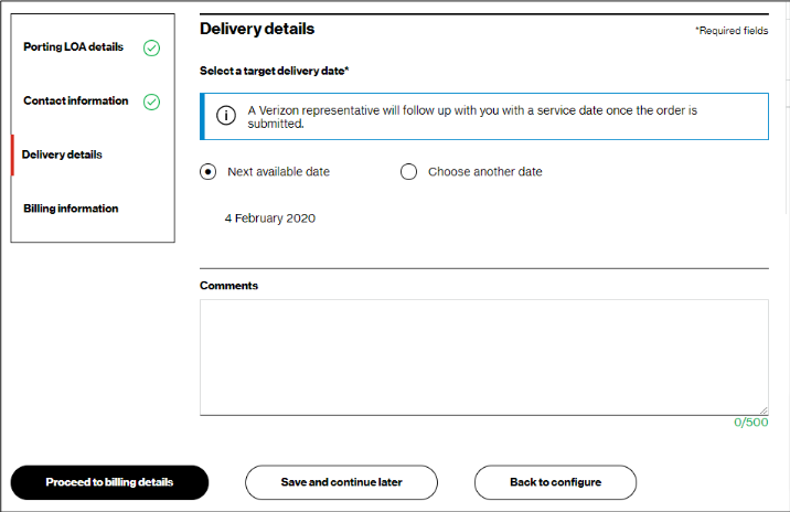 16. In the Checkout – Delivery details step, you can view the order target delivery date, and click Proceed to billing details. The target delivery date is an estimated date, as each order has unique circumstances.