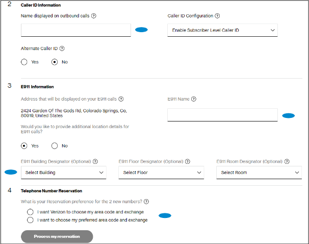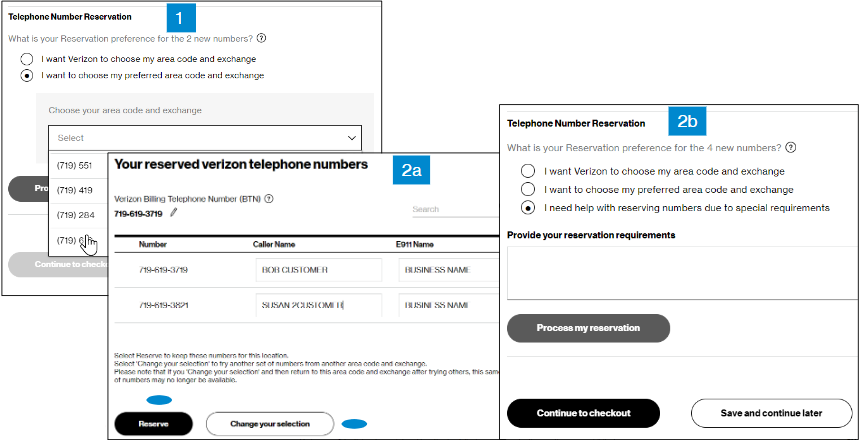 Step 1. Have Verizon choose your area code and exchange, or choose the area code and exchange yourself, and click Process my reservation.