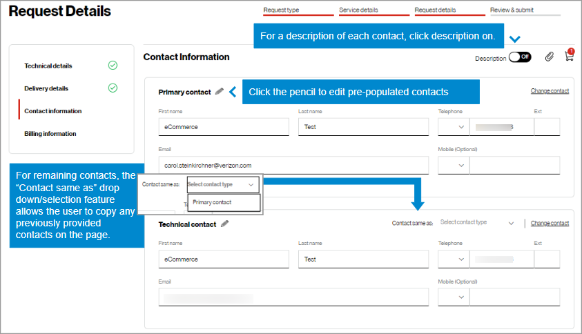 - Populated configuration and technical details from existing services can be edited for new requests