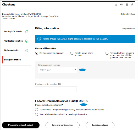 18. In the Checkout – Billing information step, you must select your billing account number (BAN). You can bill to an existing account, create a new BAN, or proceed without selecting a BAN. You must also complete the required Federal Universal Service Funds statement about whether you are purchasing the service for your own use or for resale. After making your selections, click Proceed to review & submit.