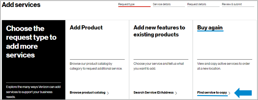 Finding the service that you want to add | If can’t find the product, click on Buy again to search for similar service. |