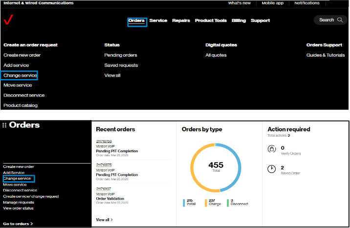 2. Hover on Orders and click on Change service under Create an order request.. On the Verizon Enterprise Center home page, you can also click on Change service in the Orders pod for the same option to create an order. Change Service is supporting requests for additional and new voice services such as business lines (POTS), outbound switched long distance, ID codes, Toll Free, and VoIP services.