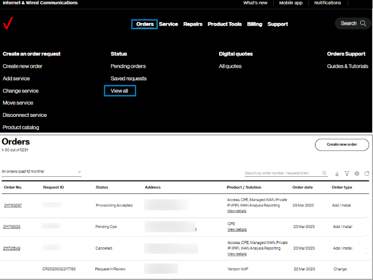 Tracking the order | Once an order is submitted you will receive onscreen confirmation and email confirmation with a tracking number that starts with SR. Search on that number in Verizon Enterprise Center by hovering over Orders, clicking Status and clicking on Pending Orders to track your order. If your order status list is empty, you may try to change the filter in the upper left of the table, or click on the funnel icon. You may also change the sequence of the columns and add new columns using the gear icon. |