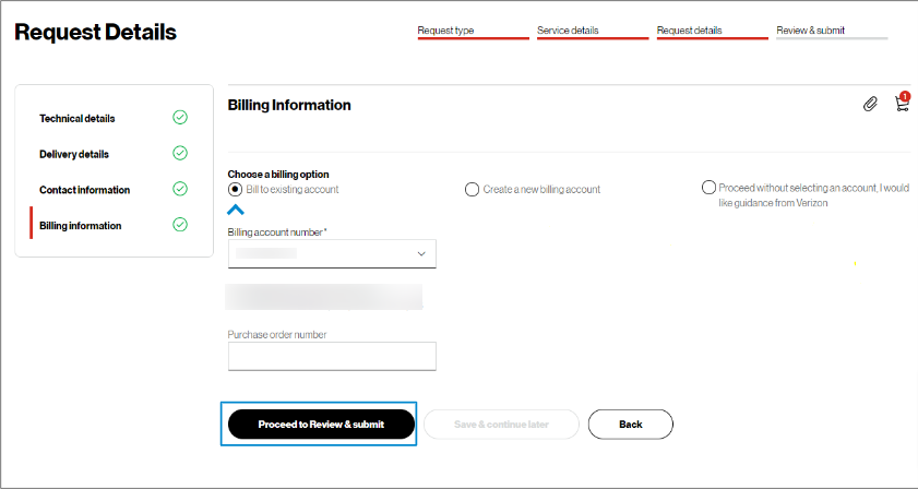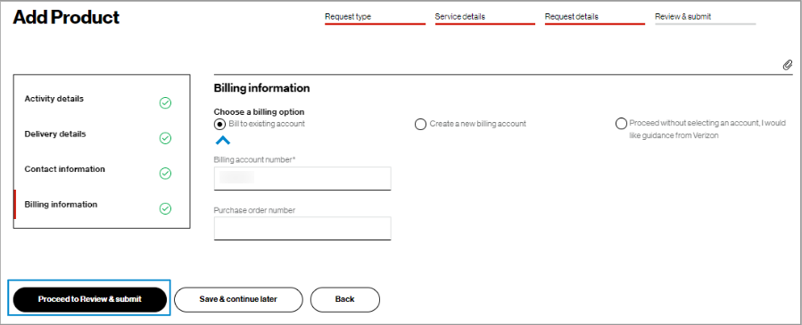 17. You may choose to bill to an existing account, create a new billing account, or proceed without selecting an account and getting guidance from Verizon.