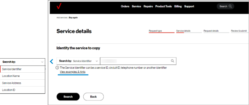 To identify the service to copy, search by entering the existing service identifier, location name, service address, or location ID.