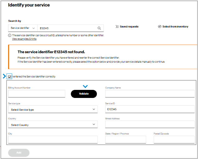 Note: If the service identifier is not found, its associated billing account number may be missing from your user profile. Please contact your Verizon representative or company point of contact to add these accounts to your profile to support future requests.