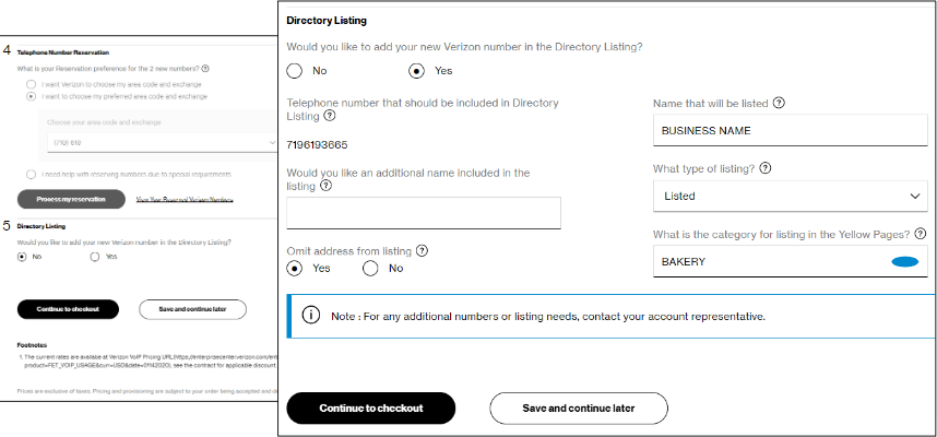 13. The fifth item in the Configure & pricing step is Directory Listing. This option does not display until after you complete telephone number reservation. If you want to list your business in the Yellow Pages, select Yes for Directory Listing and input the Yellow Pages category under which you want your business listed. Click or hover on any help icons if you want more information about a field.