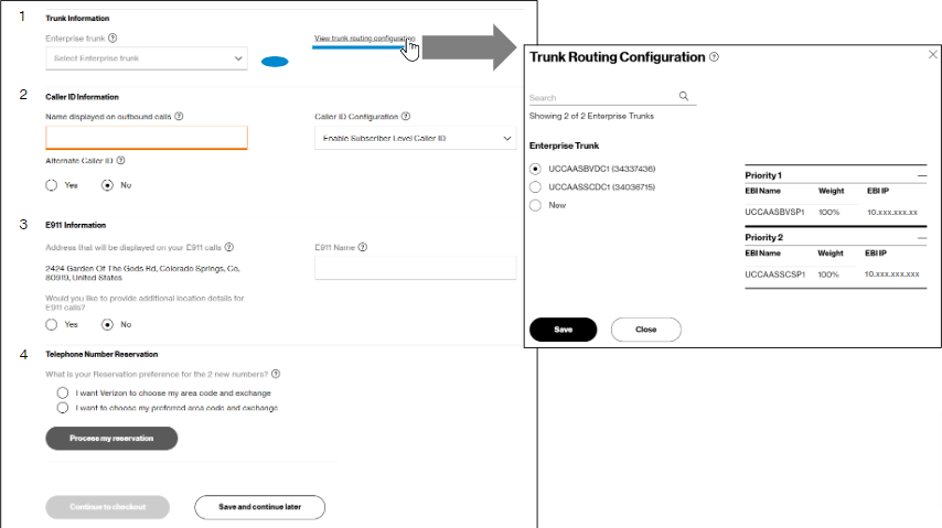 Step 2a.You may either click on Reserve to accept the numbers shown or click on Change your selection to try again. You may edit the caller/E911 names here, or you can customize them later in the Integrated Administrative Console (IAC) tool. Click Save edit or Close to proceed. If you have special requirements for your numbers, choose Change your selection and go to step 2b.