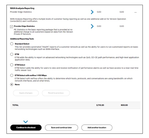 13. In the WAN Analysis Reporting section, a basic reporting package is included at no cost. You can also add reporting to provide information such as a traffic viewer tool, notification of alarms, or more detail about QoS technologies and bandwidth use. Click Apply changes if you make any changes to update the pricing, and then click Continue to Checkout.