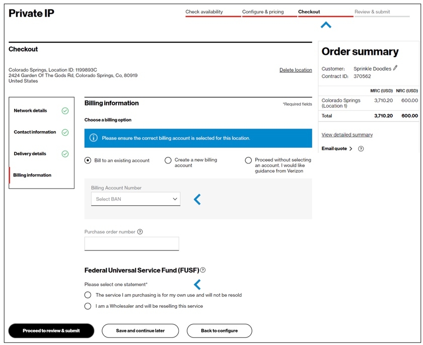 17. In the Checkout – Billing information step, you must specify your Billing Account Number (BAN). You can bill to an existing account, create a new BAN, or proceed without selecting a BAN. You must also complete the required Federal Universal Service Fund Statement about whether you are purchasing the service for your own use or for resale. After making your selections, click Proceed to review & submit.