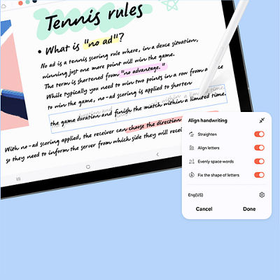 - Samsung account login required and internet connection. Handwriting Assist is available for text in Note only (200-4,000 characters).